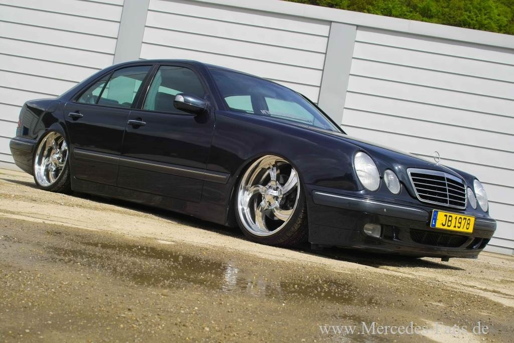 Schöne Sterne stehen nicht nur am Himmel, sondern sind auch auf Erden anzutreffen. Das weiß jeder Fahrer eines Mercedes zu erzählen. Mit Ausnahme von E-Klasse Pilot Jerome Badelle lobpreisen die meisten auch die überirdischen Qualitäten ihres automobilen Weggefährten. Der Luxemburger findet nämlich, dass sein E270 aus der W210 Baureihe die beste Figur macht, wenn die Bodenfreiheit seiner Mercedes-Limousine dem Erdboden gleichgemacht wurde – sprich per Luftfahrwerk ganz flach auf dem Asphalt liegt.