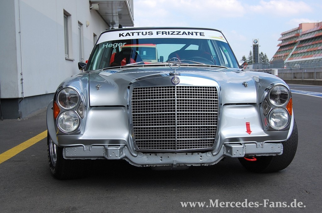 Wenn Pilot Altfrid Heger den großvolumigen Achtyzylinder des Mercedes Youngtimers anwirft, machen alle Umstehenden erst einmal einen respektvollen Schritt nach hinten. Rund 445 PS grollen aus acht Pötten und schmettern ihren Donnerhall durch eine zweiflutige Auspuffanlage nach hinten. Man hätte es ahnen können. Der 300 SEL 6.3 des HCP-Teams schaut nämlich auf den ersten Blick nicht so aus, als wäre er zum Spaßen aufgelegt. Ganz im Gegenteil. Und wohl auch nicht ganz unbegründet nannte man einen entfernten Verwandten von ihm „rote Sau!“ Also, bitte Herr Redakteur, befleißigen Sie sich doch gefälligst einer anderen Wortwahl…