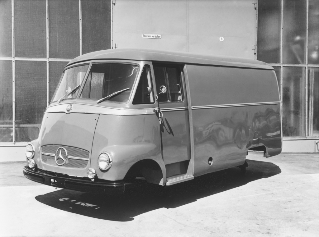 Mercedes-Benz Versuchskarosserie als Kastenwagen in Hinführung zum 1955 präsentierten L 319. Die Frontpartie unterscheidet sich noch vom spä teren Serienfahrzeug.