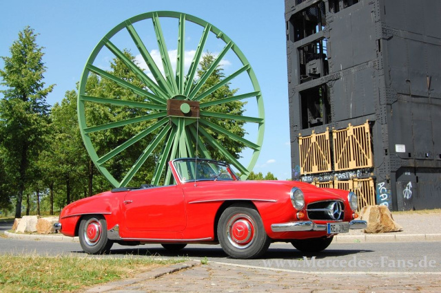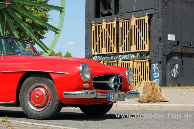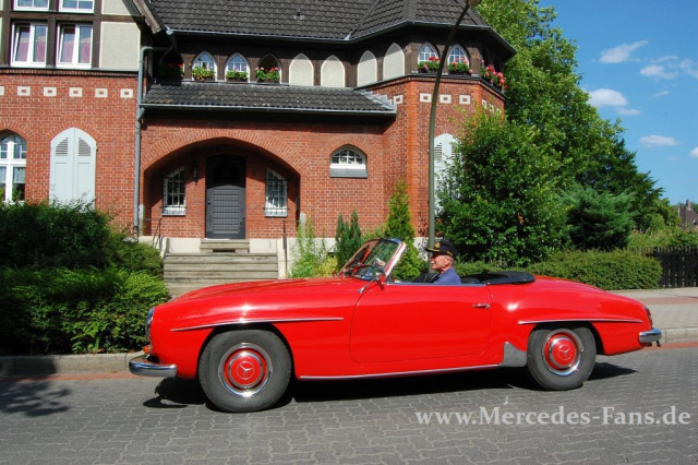 Hoch soll er leben und ewig möge er fahren! Ein Mann und sein Mercedes Veteran stießen am 15.7.2010 mit Blubberwasser und Ölkännchen auf ein besonderes Ereignis an. Just an diesem Tag vor 50 Jahren erlebte ein Star unter den Sportwagen-Klassikern seine Erstzulassung. Bei dem Jubiliar, dem man zu seinem tollen Befinden nur gratulieren kann, handelt es sich um den originalen Mercedes 190 SL von Friedrich-W. Thüner . Der Öffentlichkeitsarbeiter im Dienst des Mercedes-Benz Veteranen Club lenkt seit 23 Jahren die Geschicke des granada-roten W121 BII.