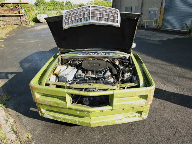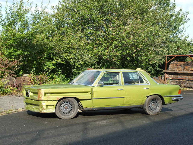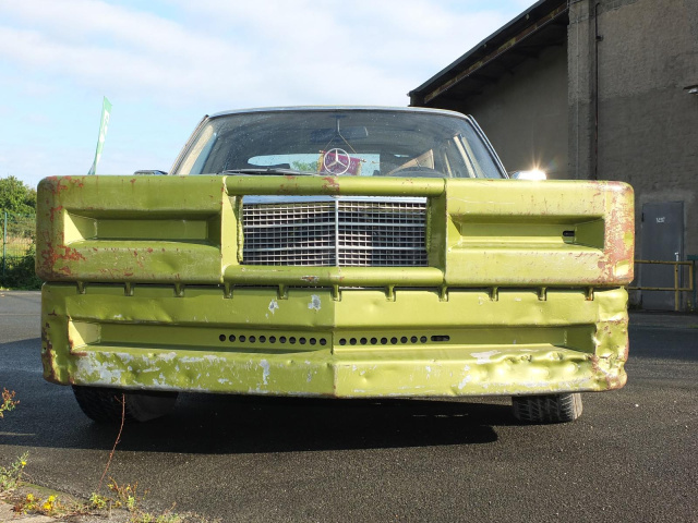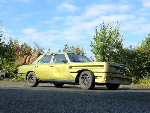 Wer diesen Mercedes-Benz 450 SE Baujahr 1978 zum ersten Mal erblickt, reibt sich ungläubig die Augen: Ein citrusgrün-metallic farbenes Ungetüm, dessen Front von grob angeschweißten Leitplanken geformt wird. Nicht elegant, nicht repräsentativ, sondern kompromisslos crash- und kampfbereit. Dieser Benz sieht nicht nur auf den ersten Blick außergewöhnlich aus, sondern auf jeden weiteren auch. Und das hat einen besonderen Grund.