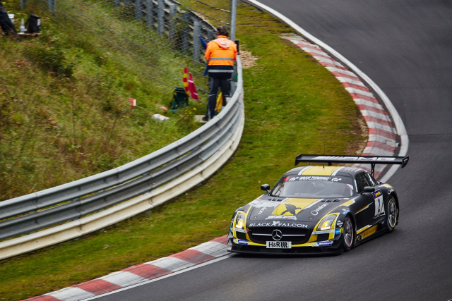 Einen ebenfalls gelungenen Start in die Veranstaltung hatte der SLS AMG GT 3 mit der Startnummer 3 und den Fahrern Abdulaziz Bin Turki Al Faisal, Yelmer Buurman, Steve Jans und Sean Johnston hingelegt. Mit Position 5 im Training hielt man sich alle Chancen auf ein erfolgreiches Rennen offen. Doch schon in der Einführungsrunde zum Rennen schlug der Defektteufel zu: „Kein Vortrieb, Schaden an der Antriebswelle“, rapportierte ein enttäuschter Startfahrer Buurman über Funk an sein Team. Ans Aufgeben dachte trotzdem niemand: Nach einem rekordverdächtig schnellen Austausch des defekten Teiles, konnte sich das Quartett durch konstant schnelle Zeiten wieder nach vorne arbeiten und auf Gesamtrang 30, sowie Klassenrang sieben die Ziellinie überqueren.