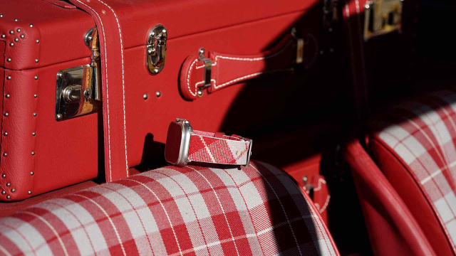 Genau dieses Detail greift die „Sonderedition Gullwing“ auf. Statt einfach nur „altes Leder“ zu recyceln, entschieden sich die Macher für die historisch korrekten Stoffe aus der berühmten Sattlerei von HK-Engineering. Das Ergebnis ist ein Armband in den ikonischen blau-grauen oder rot-grauen Karomustern. Es ist ein Design-Zitat, das Kenner sofort als Referenz an die deutsche Wirtschaftswunder-Ära identifizieren, während es haptisch einen warmen Kontrast zum kühlen Gehäuse der Smartwatch bildet.