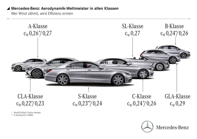 Wer Sprit sparen will, muss sich als Hersteller mit dem Thema Luftwiderstand auseinandersetzen. Gute Aerodynamik leistet nämlich einen elementaren Beitrag zur Senkung des Kraftstoffverbrauchs. Eine Verbesserung von einem Hundertstel beim cw Wert etwa hat eine Spritersparnis zufolge, die sich sonst nur mit einer Gewichtsreduktion des Fahrzeugs um rund 100 kg erzielen ließe. Aerodynamik ist also ein wichtiger Faktor beim Fahrzeugbau. Seit fast drei Jahrzehnten erzielen die Aerodynamiker von Mercedes-Benz einen Rekord nach dem anderen. Die geradezu traditionelle Windschnittigkeit ist auch den neuen Modellgenerationen von C-Klasse und S-Klasse sowie den neuen Modellen wie GLA und CLA mit auf den Weg gegeben. Wer bietet weniger? Niemand! Und also ist Mercedes-Benz unangefochtener Aerodynamikweltmeister in allen Klassen.