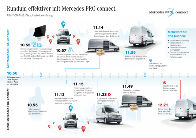 Dadurch sichert Mercedes PRO connect eine effiziente Kommunikation und Interaktion zwischen Flottenmanager und Fahrer. Auftrags- und Tourendetails können direkt übertragen werden. Das verbessert sowohl den Ablauf innerhalb des Unternehmens als auch die Zufriedenheit der Kunden. Verzögerungen und Verspätungen reduzieren sich auf ein Minimum. Auch die administrativen Aufgaben innerhalb des Unternehmens verringern sich. Zudem erschließt die Lösung Potenziale für Kosteneinsparungen, steigert die Nachhaltigkeit und Sicherheit im Fahrzeugbetrieb, sowie die Verfügbarkeit der Fahrzeuge. Das neue Dienstleistungsangebot kann für die Mercedes-Benz Transporter Vito und Sprinter nachgerüstet werden.