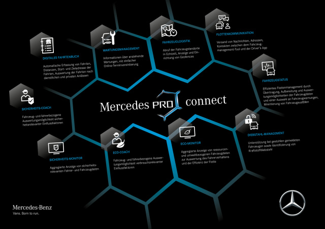 Im ersten Halbjahr 2017 kommt zunächst die innovative Konnektivitätslösung Mercedes PRO connect auf den Markt. Sie eignet sich für Fahrzeugflotten im Kleinstgewerbe bis hin zu Großflotten. Bei diesem webbasierten Service ist der Fuhrparkmanager über das Fahrzeugmanagement-Tool mit allen Fahrzeugen und Fahrern verbunden. Er kann nicht nur online Aufträge steuern, sondern auch jederzeit Standort, Kraftstoffvorrat, Wartungsintervall und weitere Fahrzeuginformationen in Echtzeit abfragen. Der Fahrer kommuniziert mit dem Flottenmanager via Driver’s App auf seinem mobilen Endgerät.
