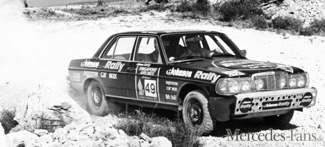 Für die Baureihe W123 ist der Rallyesport kein unbekanntes Terrain. Im Gegenteil: In der Mercedes-Motorsport-Geschichte markiert sie einen Meilenstein, der auf das Jahr 1977 datiert. Am 12. August 1977 starteten Andrew Cowan, Colin Malkin und Mike Broad mit ihrem Mercedes 280 E beim damals härtesten Autorennen der Welt: der Rallye London-Sydney. 30.000 Kilometer quer durch Europa, Asien und Australien galt es zu bewältigen. Der 280 E ging nahezu seriennah ins Rennen. Fahrwerk und Auspuff waren verstärkt, als Stoßstangen dienten Sandbleche. Drahtgitter schützten die Scheinwerfer vor Steinschlag.
