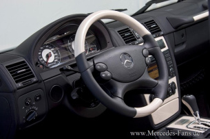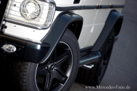 Was den Mercedes G55 Arabia von anderen G-Modellen unterscheidet, sind die eleganten Äußerlichkeiten. In zwei Finishes wird der Mercedes Allradler mit AMG DNA angeboten werden: Matt-Cashmere-White und Matt-Nightblack heißen die beiden Gaben der Farben. Optische Glanzpunkte setzten an dem Mercedes G Sondermodell ein verchromter Rammschutz und Carbon-Zierteile.