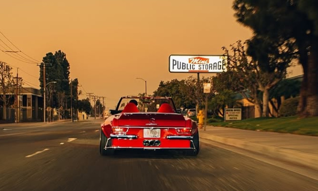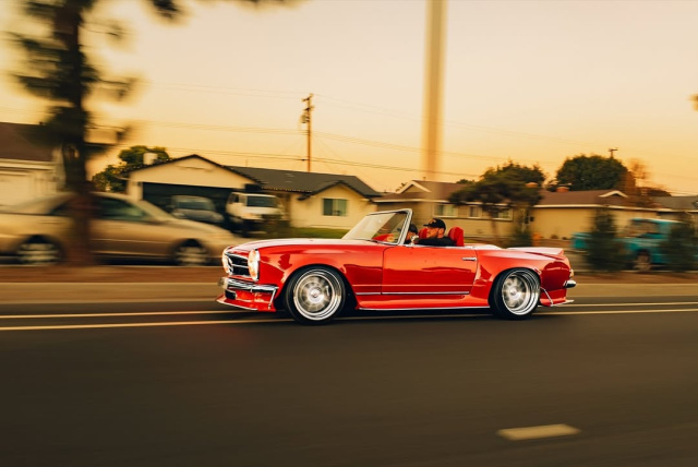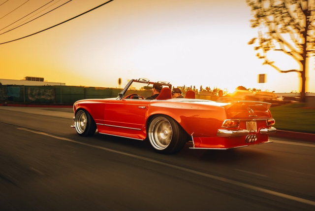 Und so hat man die per Widebody-Kit breit dynamisierte Karosserie eines 68er 280 SL auf einen Mercedes-Benz SLK 55 AMG gehievt und ihn tief auf rassige HRE-Räder positioniert.