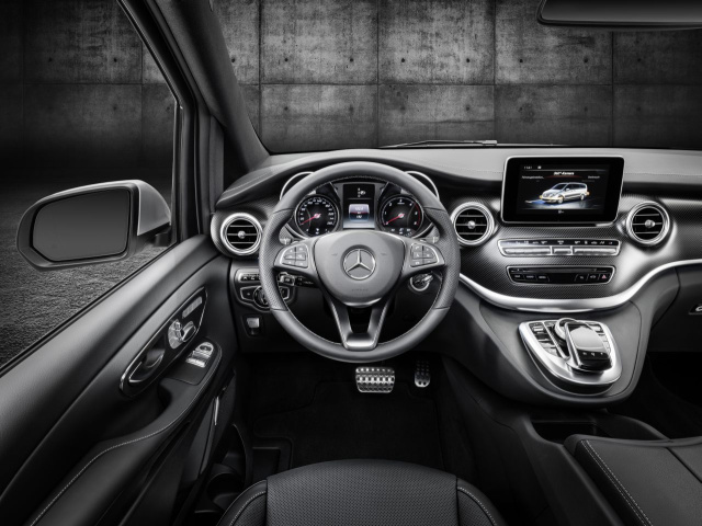 Im Innenraum lässt sich ie dynamische V-Klasse-Ausgabe mit Lüftungsdüsen in Silberchrom, Alu-Sportpedalen und Dekorparts im Carbon-Look nebst einem schwarzem Fahrzeughimmel blicken. Ausstattungslinie AMG Line ist für alle Motorvarianten und Aufbaulängen der V-Klasse und der V-Klasse AVANTGARDE erhältlich.