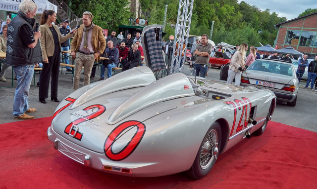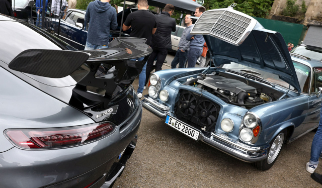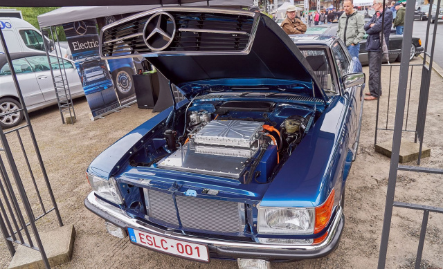 Natürlich haben sich die Objekte der fünfziger und sechziger Jahre etwas rar gemacht, aber dennoch gab es viel zu sehen. Zum Beispiel die Themen-Insel „50 Jahre SL R107". Fred Oehmke und seine Mitstreiter vom Mercedes-Benz R/C 107 SL-Club Deutschland e. V. hatten einige sehr sehenswerte Modelle auf die Hütte gestellt. Der Essener Mercedes-Benz Classic Partner Mercedes-Benz Hans Schulte-Oversohl präsentierte einen taufrisch-restaurierten 300 Adenauer. Eine Parzelle weiter zeigte das Team "Drive For Good" einen McLaren Mercedes SLR sowie einen herzzerreißend schönen 280 SE 3.5 mit AMG-Technik. Gleich nebenan bei John Rotscher Classic Parts gab es ebenfalls einen SLR zu bestaunen, nur war diese 300er Variante freihand aus dem Blech geklopft und ein reinrassiger Selbstbau. Der Mann ist ein Genie! Zurecht konnte dieses Auto dann auch die Sonderehrung „Editor's Pick" (also die Wahl des Chefredakteurs des Magazins Mercedes-Fans) einheimsen. Einen Stand weiter zeigte Monceau-Automobiles die Deutschland-Premiere des eSLC - ein vollelektrischer SL der Baureihe C107. Hier wurde nicht nur eine Batterie in ein Auto gepflanzt, vielmehr war der eSLC als Gesamtkonzept mit viel Liebe zum Detail sehenswert!
