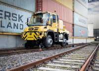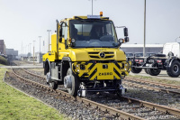 Und das macht den Unimog für den Einsatz als 2-Wege-Fahrzeug so interessant: Er kommt dank seines kompakten Achsbaumaßes ohne separaten Schienenfahrantrieb aus, sogar bei verschiedenen Spurbreiten. Mit Hilfe spezieller Felgen und Reifen kann der Unimog sowohl auf Eisenbahn-Normalspur (1435 mm) als auch auf verschiedenen internationalen Breitspuren mit seinen eigenen Rädern auf der Schiene fahren. Eine hydraulisch absenkbare Schienenführung sorgt für sichere Spurführung auf dem Gleis. An einem niveauebenen Bereich von etwa fünf Meter Länge, zum Beispiel an Bahnübergängen, kann der Unimog einfach abgleisen und auf der Straße mit bis zu 90 km/h zum nächsten Einsatzort fahren. Für den Einsatz auf Gleisen des öffentlichen Schienen-Nahverkehrs sind Schienenführungssysteme erhältlich, die das Befahren von Kurvenradien ab 18 m ermöglichen.