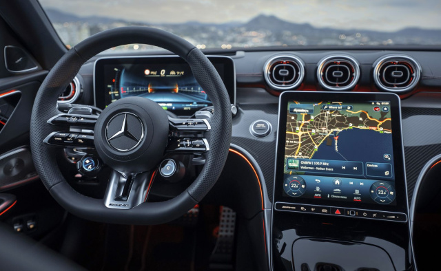 „Nicht so schnell“, sagen Sie bei AMG und verweisen auf den kernigen Klang des 350 kW / 476 PS starken Benziners. Na ja. Ganz nett, aber die Herren, die gerne zu viert im Auto sitzen und mit offener Auspuffklappe des nächtens durch die Innenstädte heizen, werden vermutlich dennoch nicht begeistert sein. Jetzt wuchert Mercedes-AMG mit dem ganz großen Pfund: Dank des 150 kW / 204 PS E-Motors an der Hinterachse leistet die PHEV-Sportler-C-Klasse 500 kW / 680 PS mit einem maximalen Drehmoment von 1.020 Newtonmetern. Das bedeutet, dass der Standardsprint von null auf 100 km/h in lediglich 3,4 Sekunden absolviert ist und erst bei 270 km/h Schluss ist. Das Ganze ist bei einem Norm-Verbrauch von 6,9 l/100 km schon ziemlich amtlich!